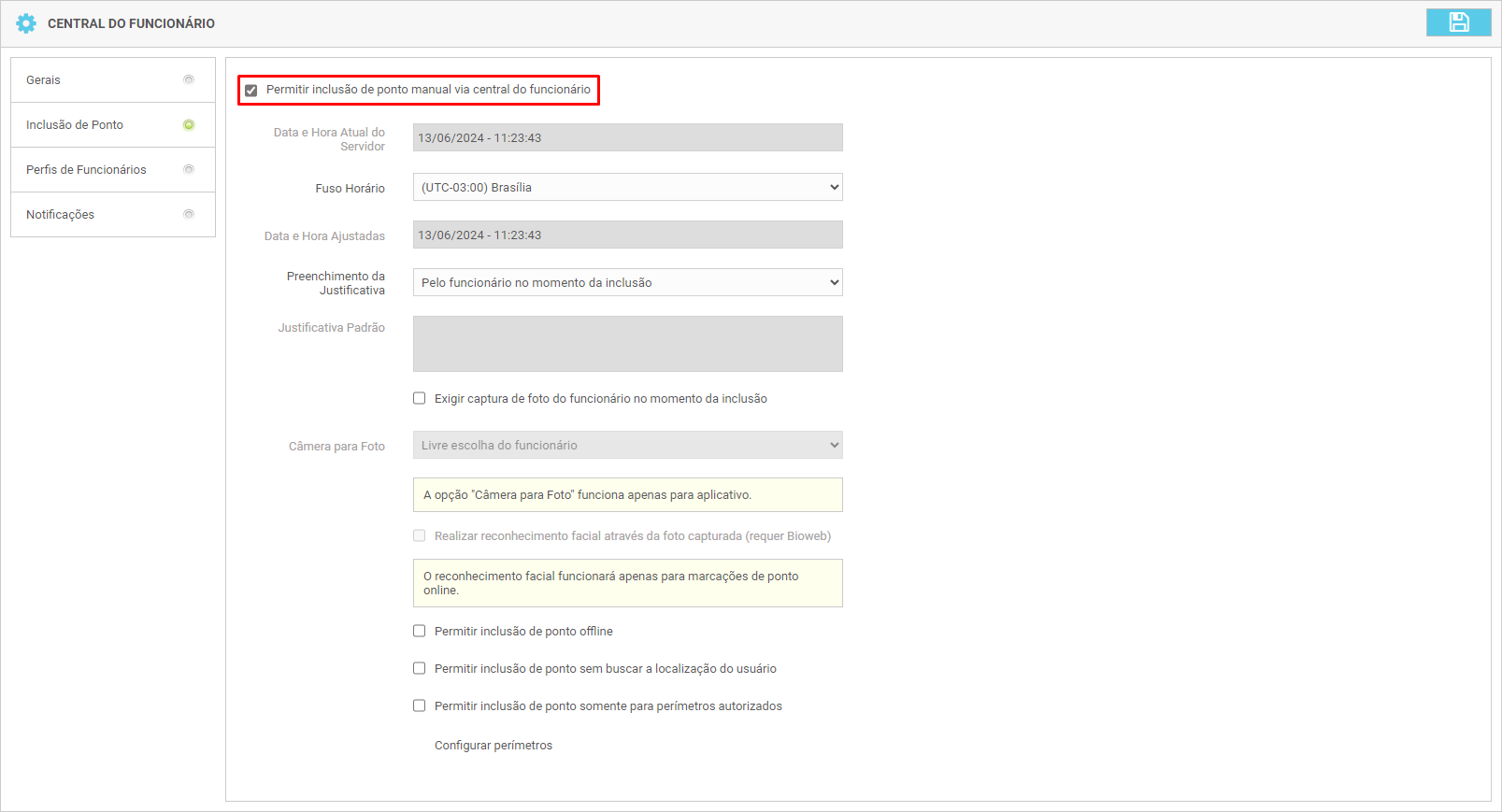 4.1. Para o funcionário poder registrar seus pontos na Central do Funcionário, o responsável pelo sistema deve ativar a opção Permitir inclusão de ponto manual via central do funcionário em Manutenções - Central do Funcionário - Inclusão de Ponto.
