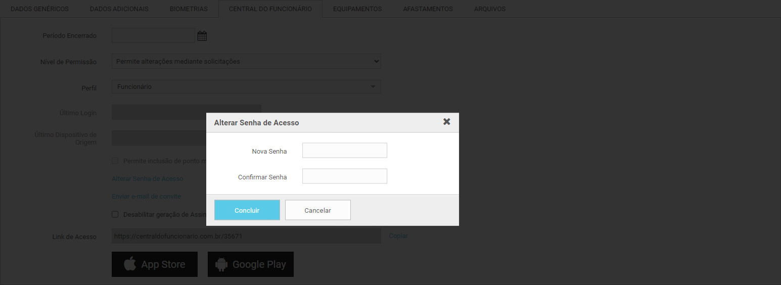 2. Vá até a opção Alterar Senha de Acesso e configure uma senha para o funcionário;