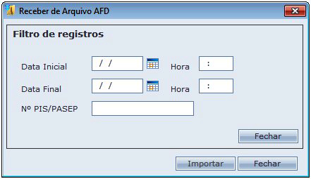 No recebimento via arquivo AFD, é possível selecionar somente um funcionário e/ou período específico que será importado. Para isso, clique sobre o botão "Filtro".
