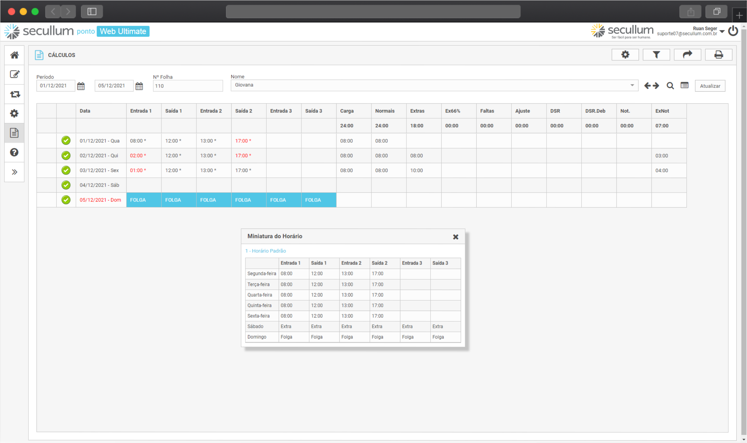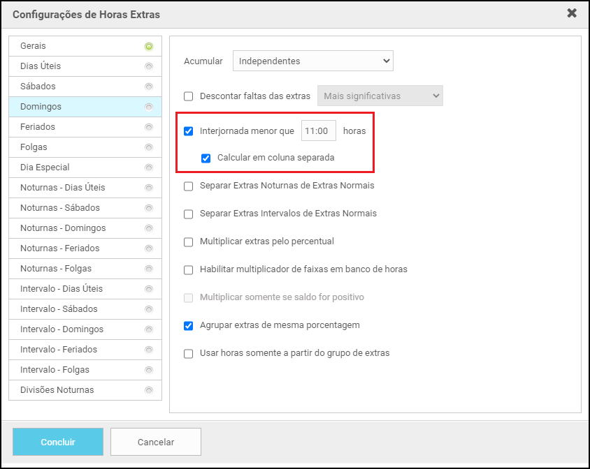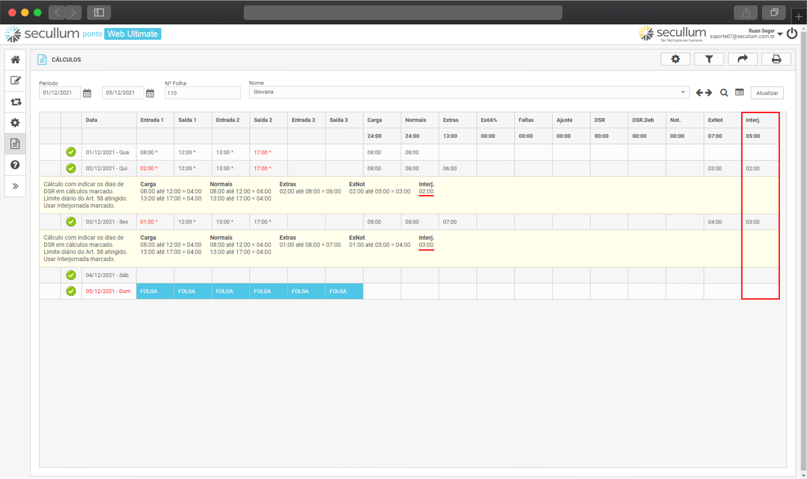 Marcando essa opção, as horas de interjornadas aparecerão em uma coluna chamada Interj. Na tela de Cálculos, diferenciando horas extras de interjornadas: