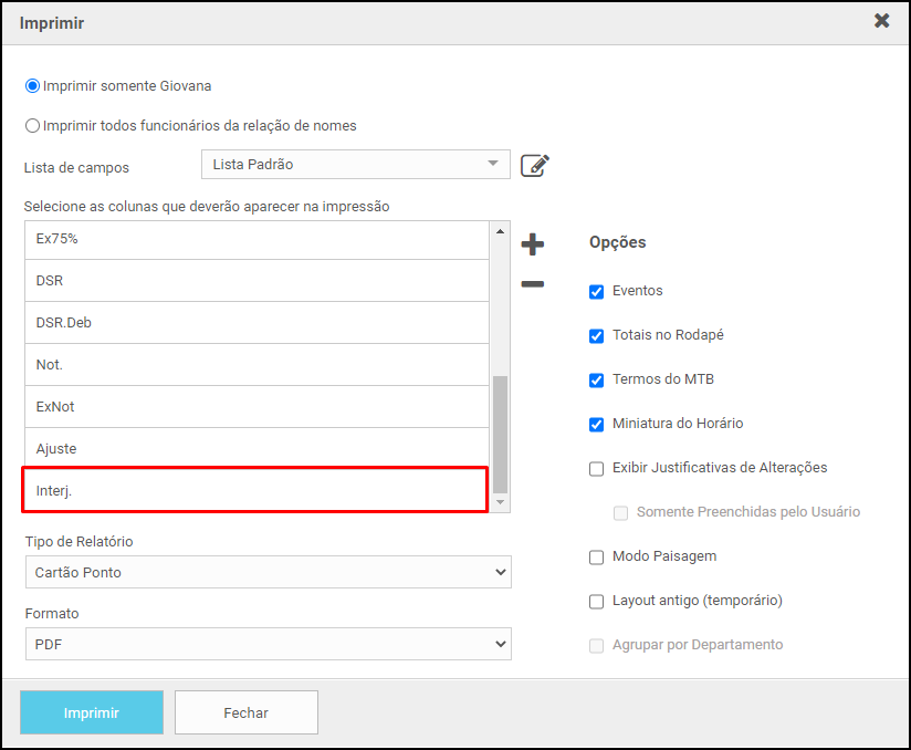 Selecione as colunas que deseja imprimir incluindo a coluna Interj., em Tipo de Relatório configure Cartão Ponto, clique em Imprimir em seguida, abaixo exemplo de um relatório: