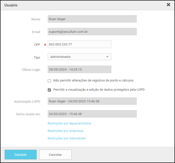 Para a geração de arquivos da Portaria 671, é necessário que o usuário e os funcionários tenham o CPF preenchido em seu cadastro.