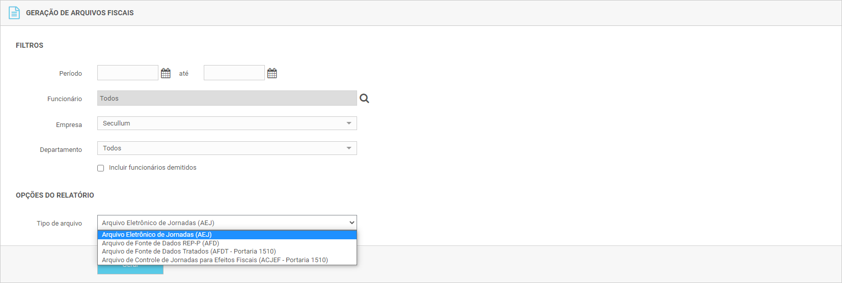 • Em Relatórios - Geração de Arquivos Fiscais, criar novo layout AFD para os registros de ponto feitos via sistema (REP-P), conforme o Anexo V da Portaria 671.