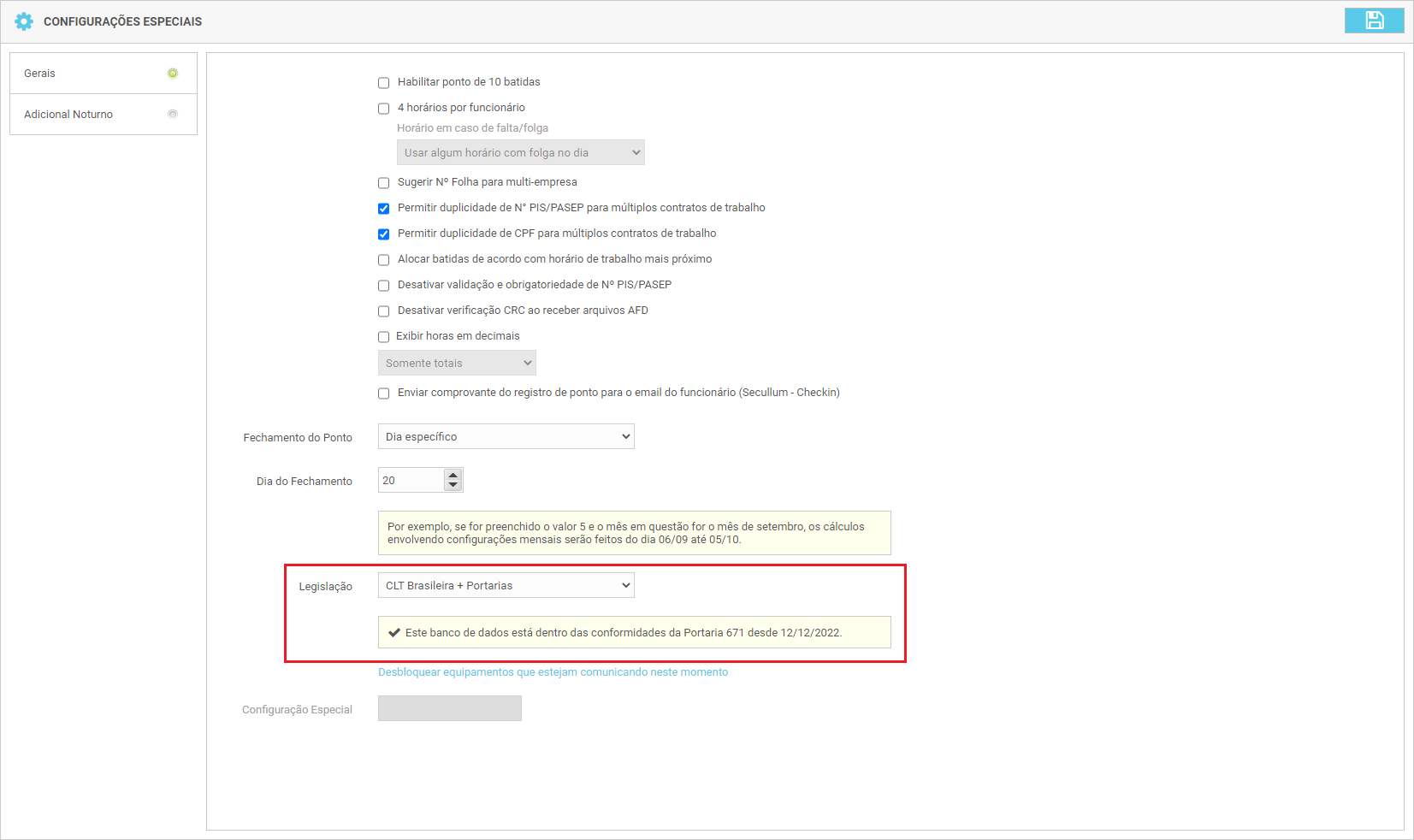 Após esta atualização, o sistema irá disponibilizar todas as funcionalidades da Portaria 671 e ficará indicado em Configurações Especiais a Data de Início da Portaria 671 deste banco de dados. Esta informação é importante para indicar aos clientes e fiscais que todos os arquivos fiscais e comprovantes só serão válidos a partir desta data.