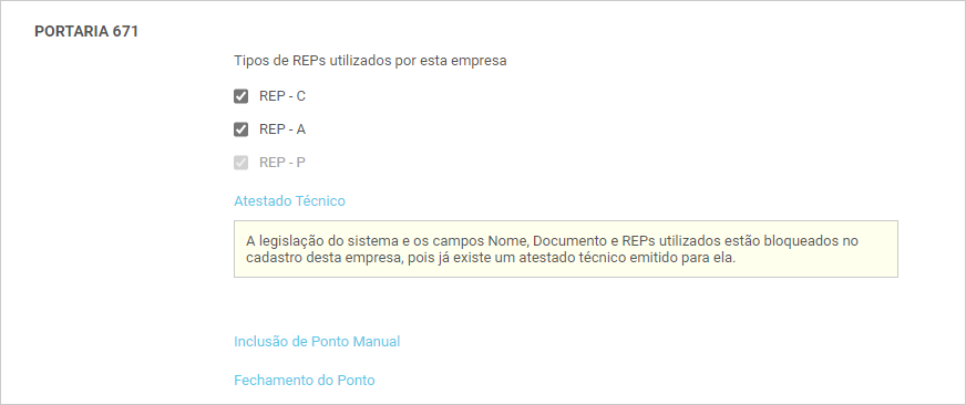 Exemplo: Se a empresa foi configurada para usar somente REP-C, não poderá usar equipamentos de acesso e nem aplicativos da Secullum.
