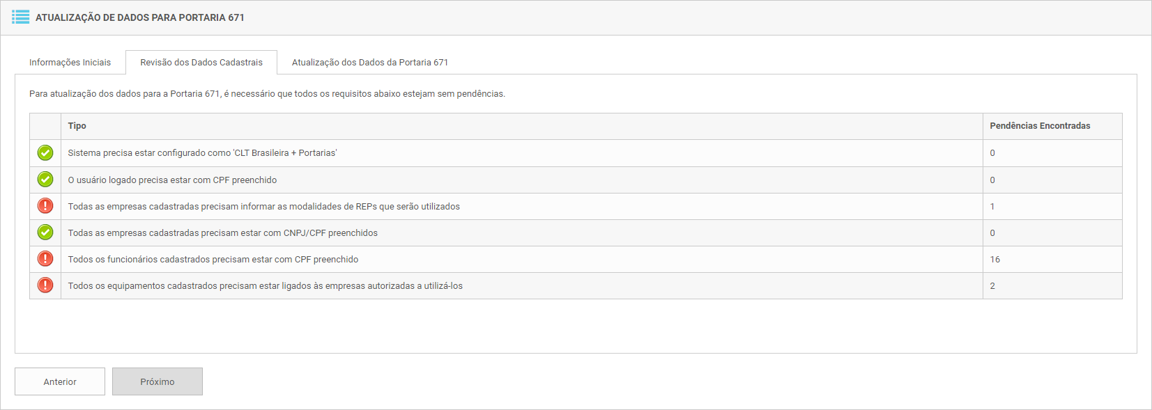 Nesta tela o usuário deverá seguir os passos para completar as etapas, conferindo quais dados são necessários atualizar para entrar em vigor com a Portaria 671.
