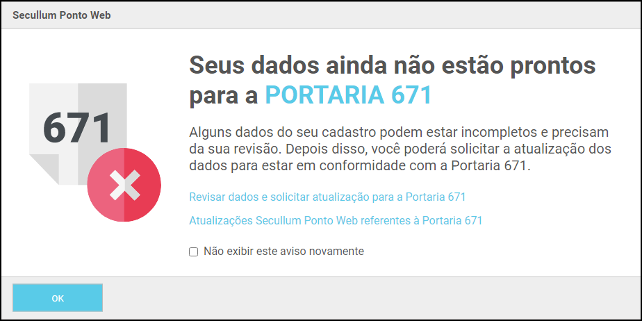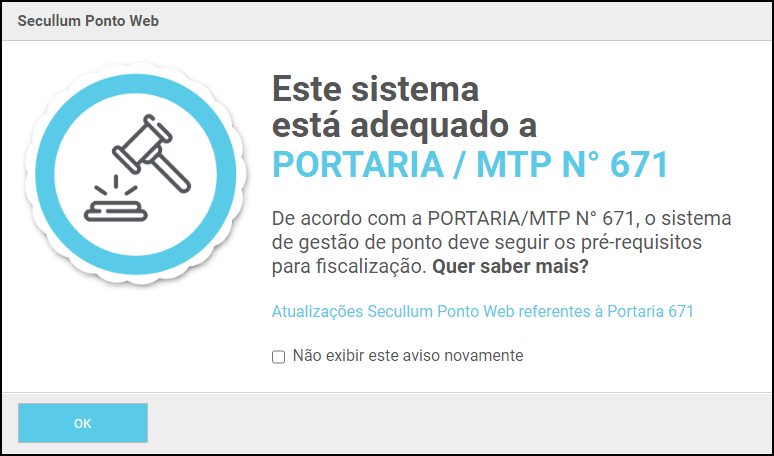 Para novos clientes, ao abrir o sistema, será apresentada uma tela indicando que o sistema possui as funcionalidades da Portaria 671: