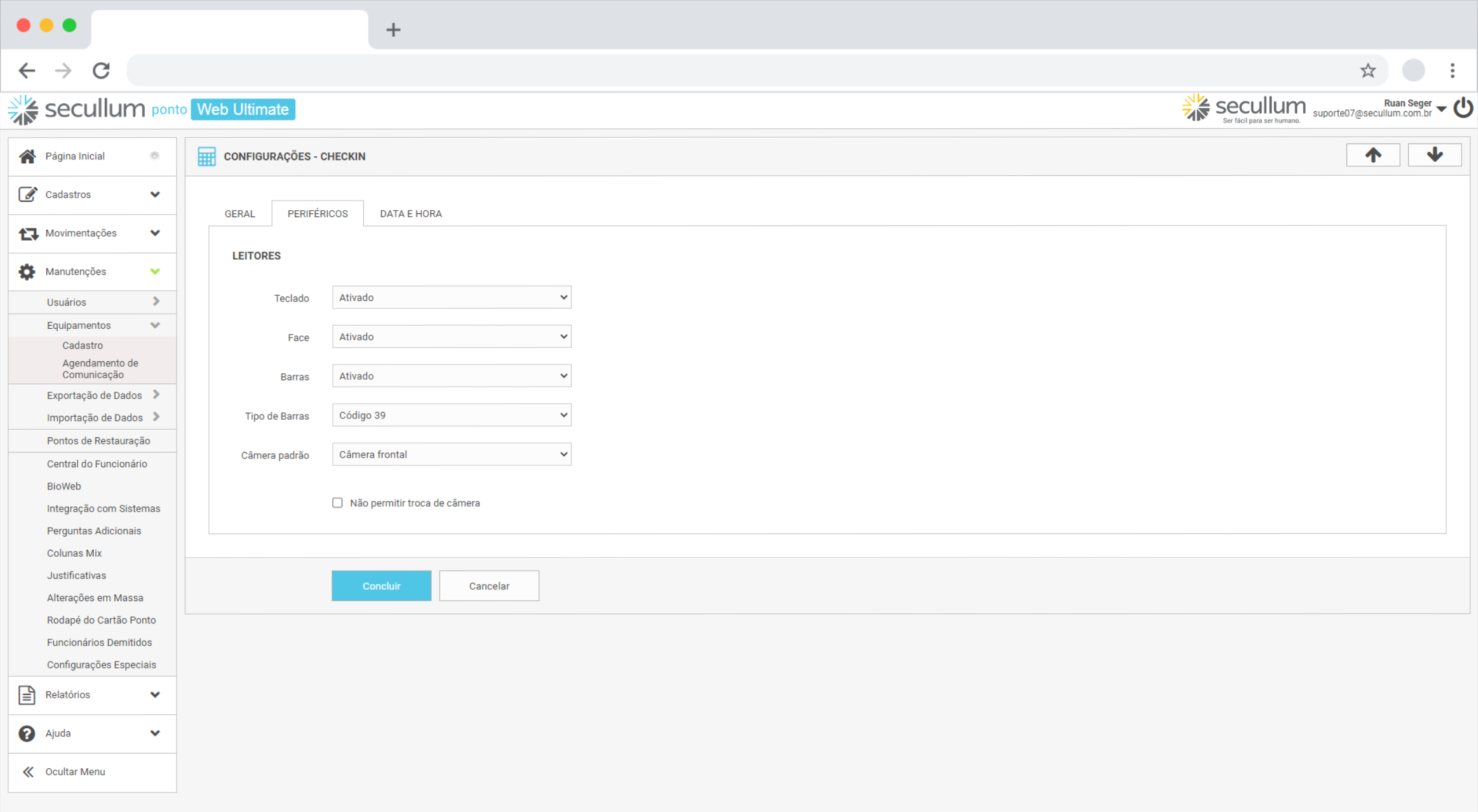 Depois de cadastrar o equipamento e configurar o Checkin corretamente, entre em Configurações -Periféricos do equipamento no Ponto Web, para configurar os tipos de leitores onde o app funcionará: