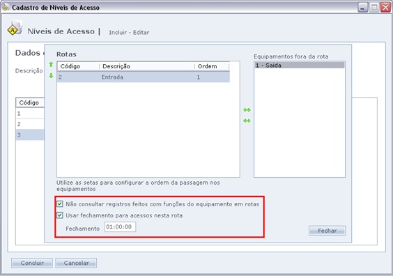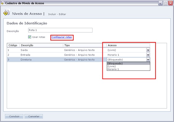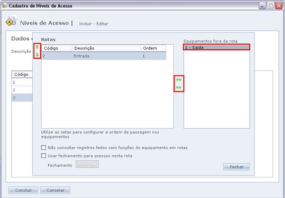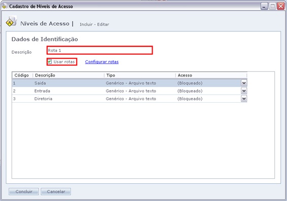 Obs.: Equipamentos configurados como Bloqueados no cadastro do mesmo nível de acesso, não aparecem na lista de configuração de rotas.
