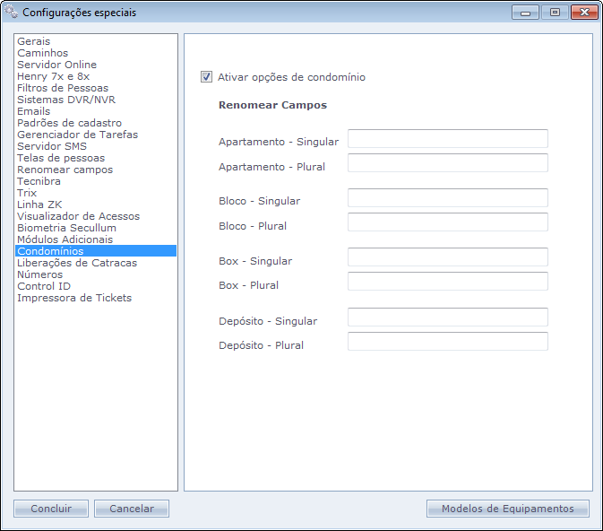 Após ativar o módulo de condomínios, conclua a tela de Configurações Especiais, feche o Secullum Acesso e abra novamente, para que as opções de condomínio apareçam.