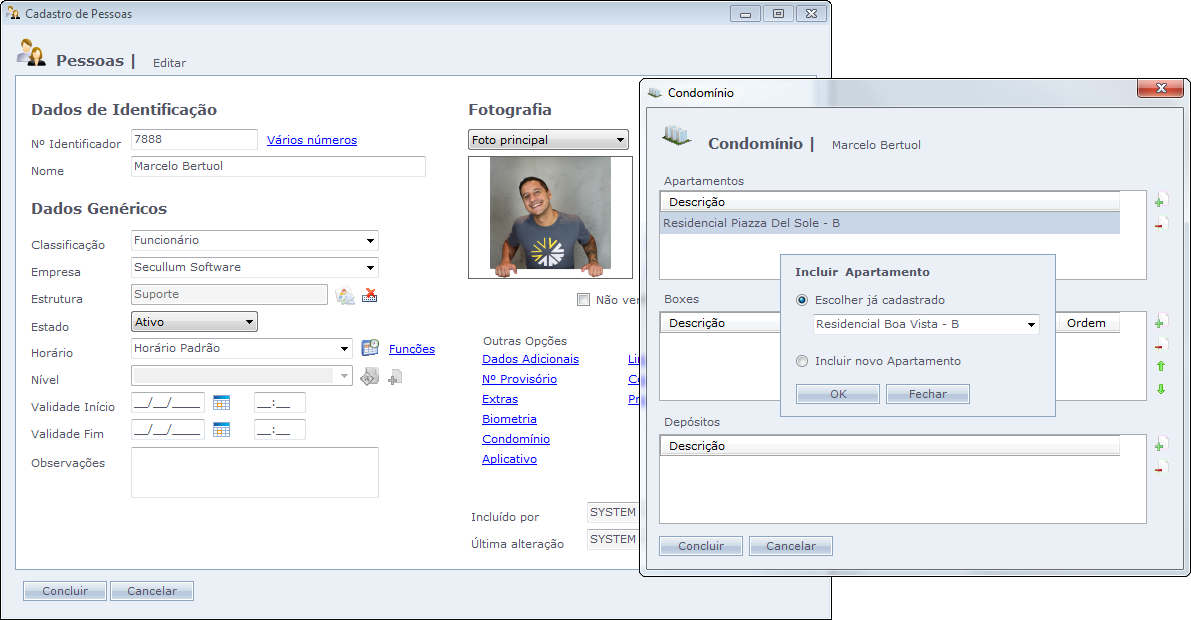 Após criado os apartamentos como no exemplo anterior, dentro do cadastro de pessoas, podemos relacionar os apartamentos clicando em Condomínio, abaixo imagem de exemplo: