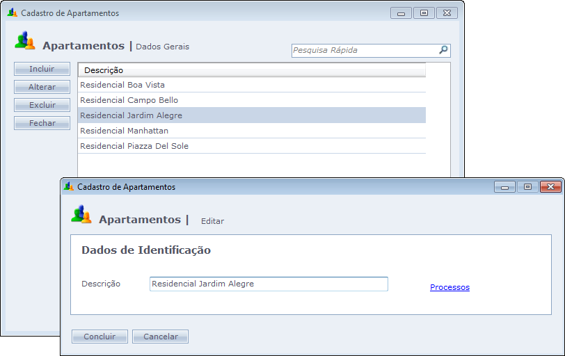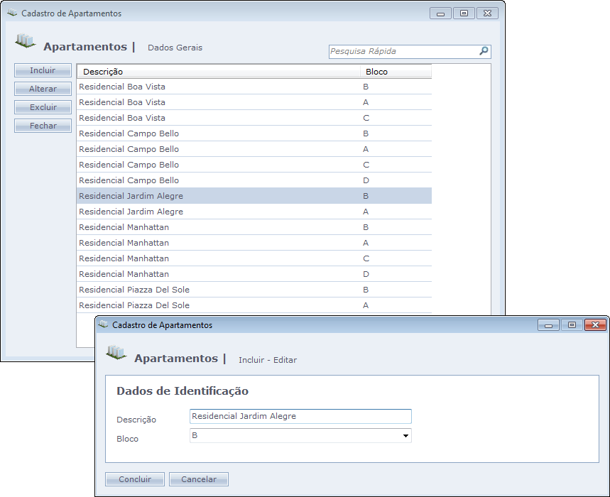 Podem ser cadastrados vários apartamentos com a mesma descrição, porém, estes devem ser associados a blocos diferentes.