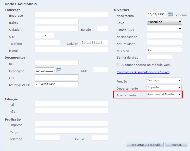 Agora dentro do cadastro das pessoas, em Dados Adicionais, aparecerá o novo filtro criado "Apartamento", onde podemos selecionar os filtros criados anteriormente, ou criá-los ali mesmo, digitando o nome do apartamento, nesse caso.