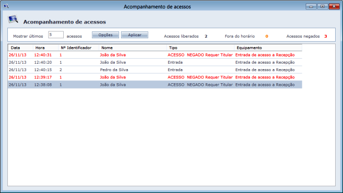 Observe que ela exibe as colunas Nº Identificador, Nome, Tipo (se os acessos foram liberados ou não e o motivo), e Equipamento.