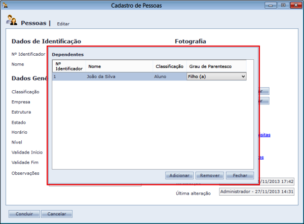• Em nosso exemplo, efetuamos o cadastro de Pedro da Silva (pai) e João da Silva (aluno);