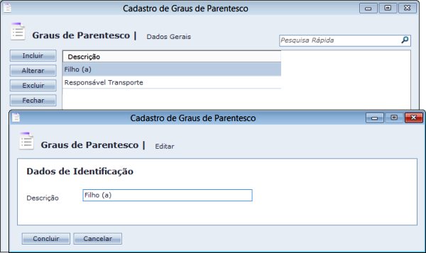 Após habilitarmos as opções do primeiro passo, o cadastro de "Graus de Parentesco" será habilitado no software. No imagem abaixo, cadastramos alguns de exemplo: