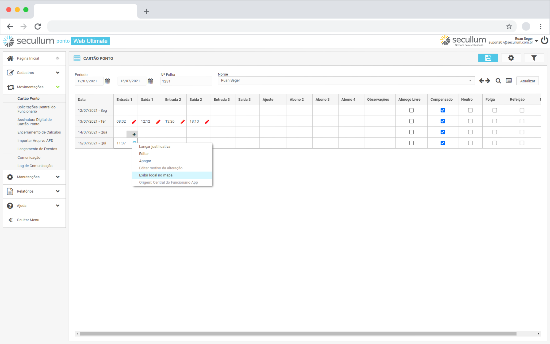 No Ponto Web em Movimentações - Cartão Ponto, é possível verificarmos o mapa da batida e também a foto do funcionário: