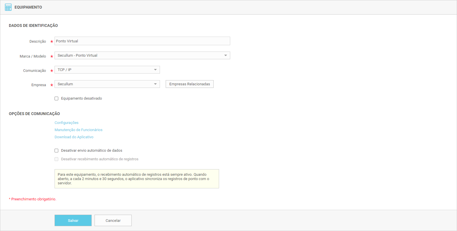 Desativar Recebimento Automático de Registros: Define se os registros serão recebidos automaticamente em intervalos de 5 minutos de inatividade na comunicação com o equipamento.