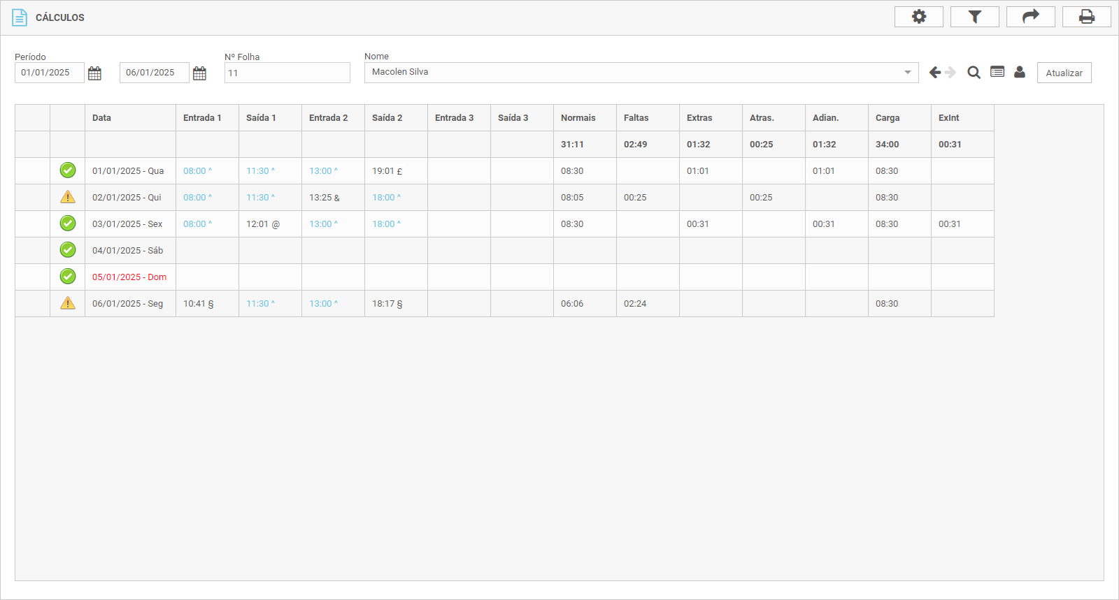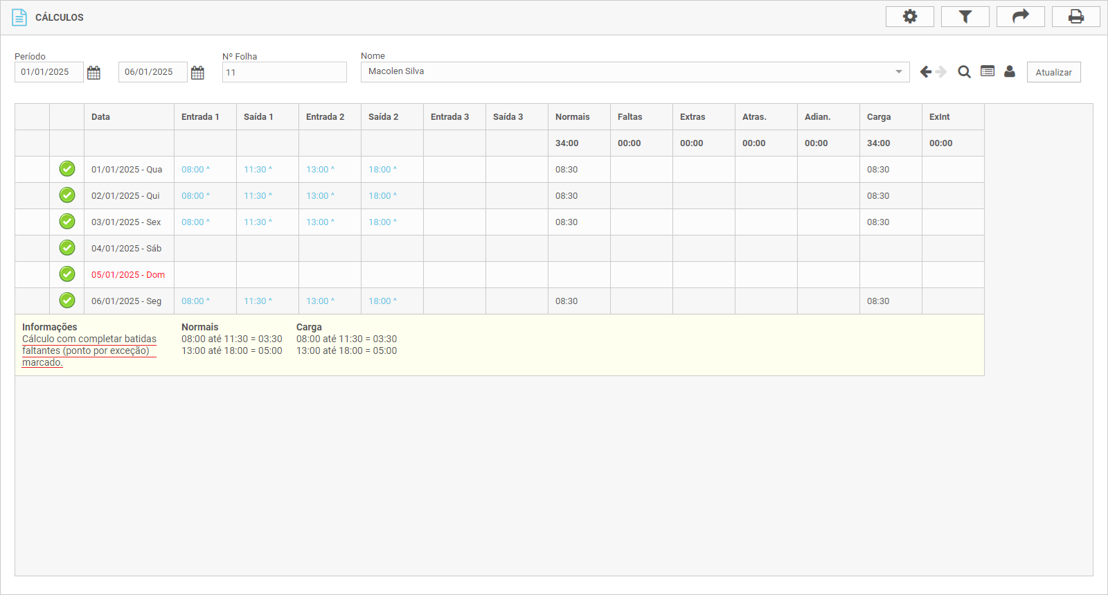 Veja abaixo um exemplo de como aparece o Relatório de Cálculos com as marcações de ponto registradas: