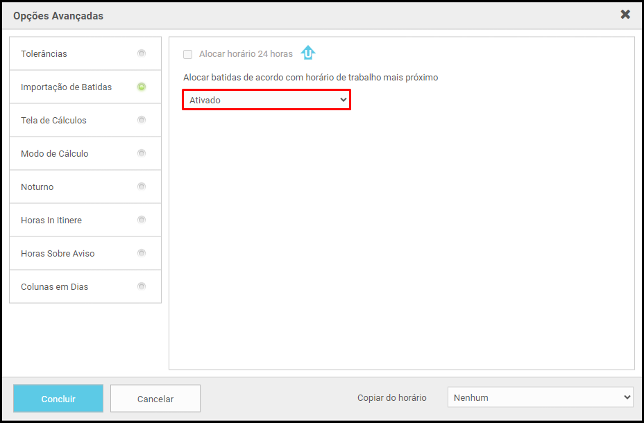 - Na opção Alocar batidas de acordo com horário de trabalho mais próximo, selecione Ativado;