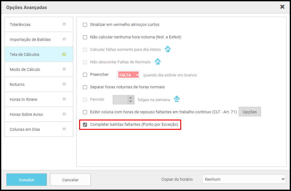 - Marque a opção Completar batidas faltantes (Ponto por Exceção), conforme imagem abaixo.
