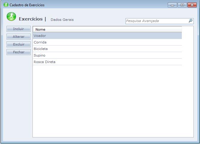 Essa opção permite que seja impressa, modificada e salva, a lista de exercícios de determinado aluno. Para utilizar essa opção, primeiramente você deve cadastrar os exercícios. Para isso vá em Cadastros > Exercícios.