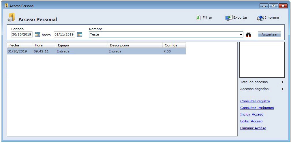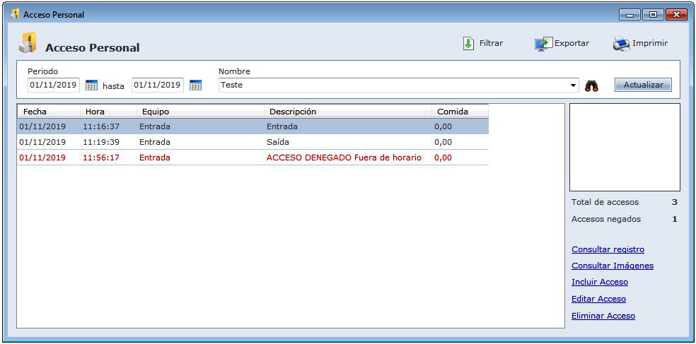 OBS: Cuando configurar un horário de comida, por ejemplo: 07:00 hasta 08:30, y la pessoa tener un horário registrado de las 05:00 hasta 23:59 + Limite de Accesos Libre, y la misma intentar pasar en el equipo de comida a las 06:30 por ejemplo, el sistema va a liberar el acceso normalmente, generando valor 0,00 de la comida. Esta liberación se pasa porque es llevado en cuenta el horário del registro del empleado, que es de las 05:00 hasta 23:59.