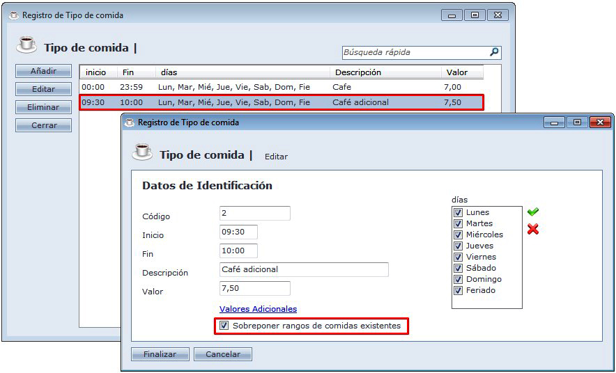 Sobrepor rangos de comidas existentes