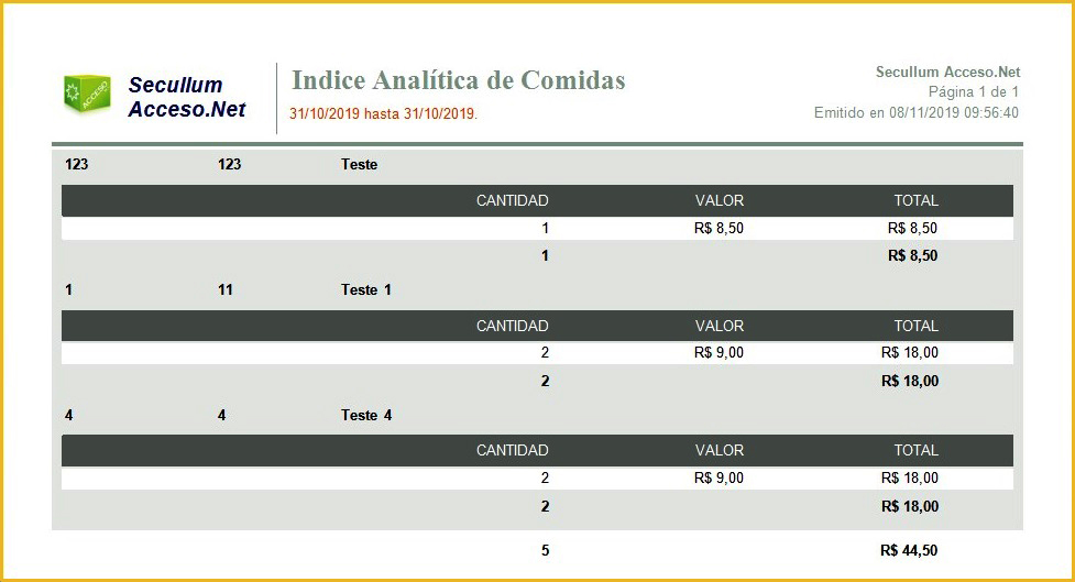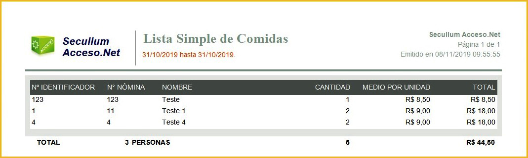 Muestra la cantidad y el valor total de las comidas, agrupado por persona. También es mostrado el valor medio de las comidas.