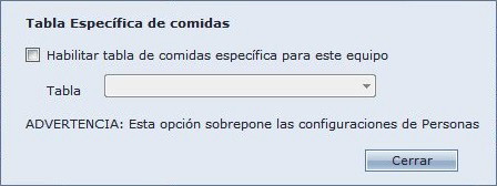 - Habilitar tabla de comidas especificas para este equipo: Marcando la opción y selecionando una tabla de comida, cuando una persona realizar un acceso en este equipo, es consultada la tabla selecionada para el calculo del valor de comida y no la tabla asosiada a la persona en la pantalla de personas.