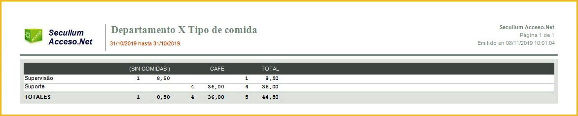 Muestra el Informe en forma de tabla, para cada linea un departamiento, y para cada columna un tipo de comida. Para cada Tipo de Comida es mostrado la cantidad y el valor total del tipo de comida.