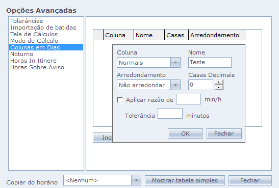 Para criar uma coluna na tela de Cálculos com Totalização em dias vá no Cadastro de Horários > Opções > Colunas em dias > Incluir:
