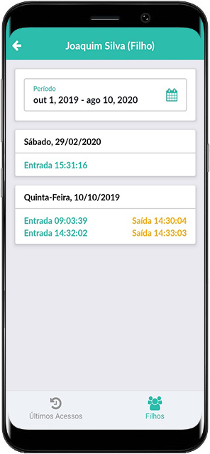 Ao clicarmos em Joaquim Silva ou Julia Silva por exemplo, veremos os acessos de entrada e saída de cada um, informando a data e hora para cada acesso. Podemos ainda filtrar o período a ser visualizado: