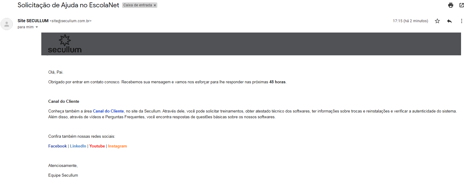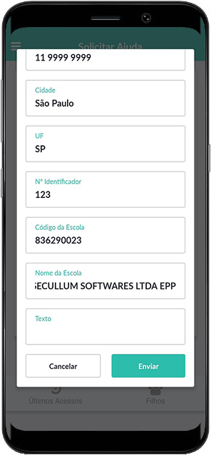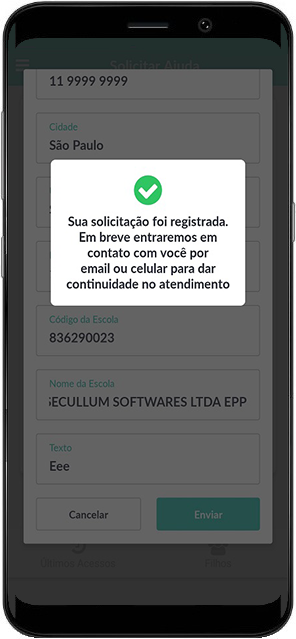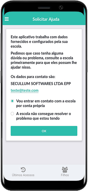• A escola não consegue resolver o problema que estou tendo: quando utilizada essa opção pelo usuário, ele terá que descrever o problema que está enfrentando no aplicativo, essa descrição junto com os dados do cliente serão enviados através de um e-mail para sac@secullum.com.br, o qual entrará em contato o mais breve possível.
