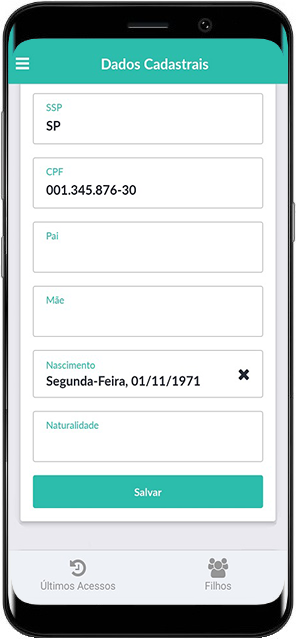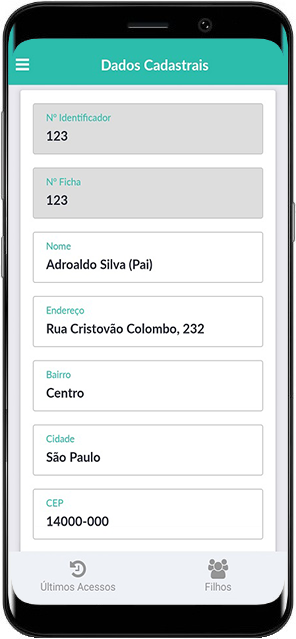 Em Dados Cadastrais, pais ou titulares podem alterar dados como: Nome, Endereço, Cidade, Telefone, Email, CPF e etc.