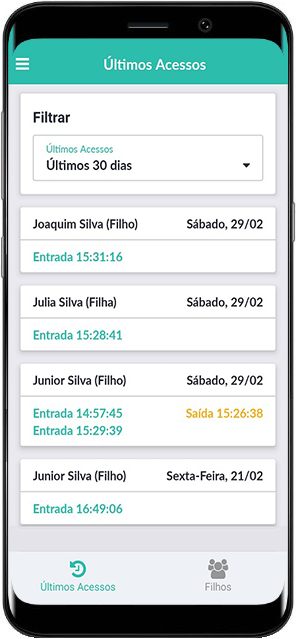 Nessa tela, podemos visualizar os últimos acessos dos filhos. Ainda é possível filtrar os acessos por: Últimas 24 horas, Últimos 7 dias, Últimos 15 dias e Últimos 30 dias.