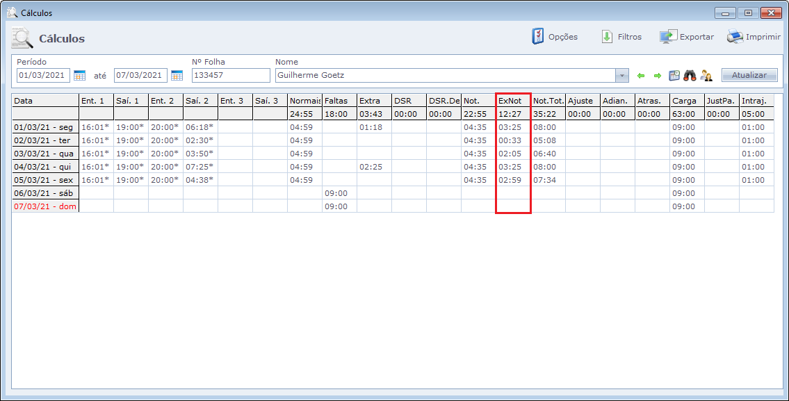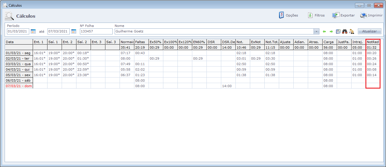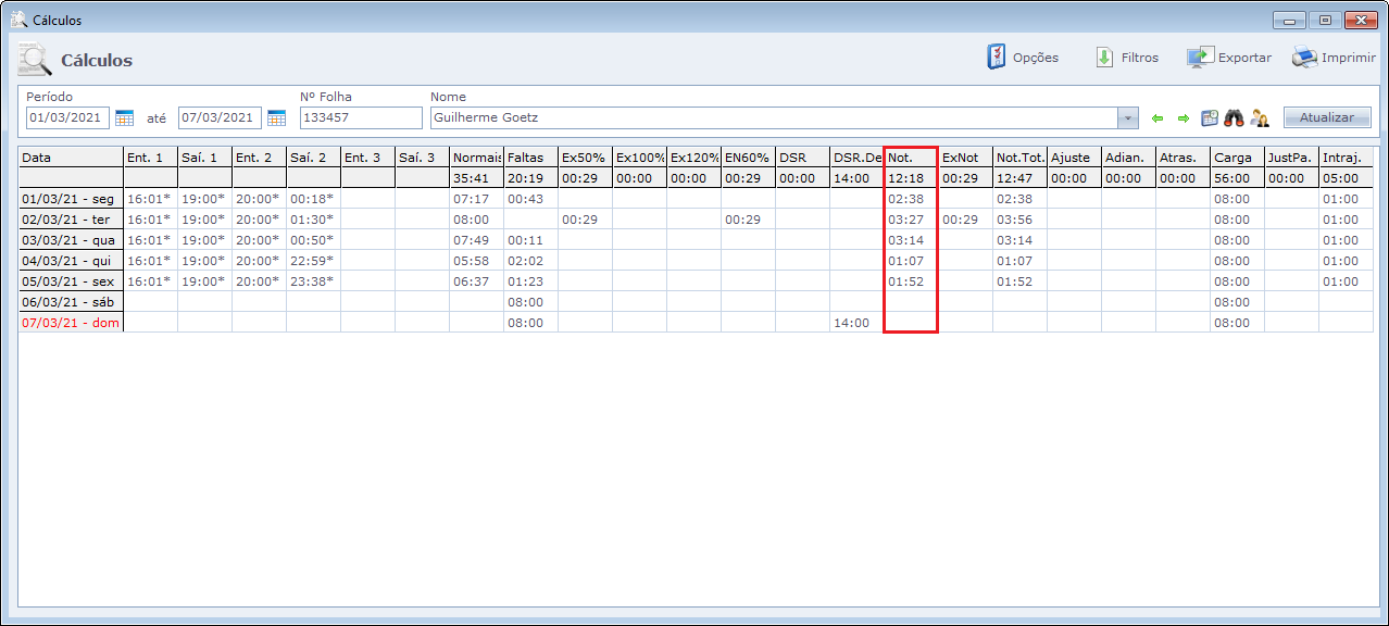 No Secullum Ponto Offline possuímos uma coluna chamada Not, que calcula o Adicional Noturno do(s) funcionário(s) que trabalham em horário noturno. Considera-se Adicional Noturno as horas normais trabalhadas em período noturno, somadas ao Adicional Noturno Reduzido pago sobre estas horas.