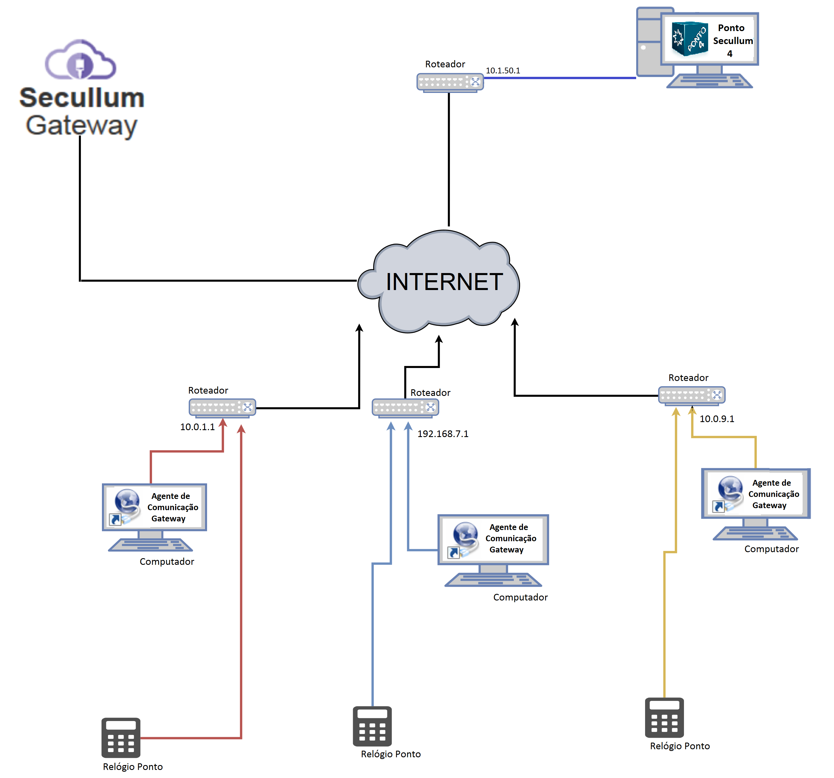 Abaixo segue um digrama simples, onde temos somente uma instalação do Ponto Secullum 4, três relógios em redes diferentes e um computador por rede. Em cada computador deve haver uma instalação do Agente de Comunicação Gateway, este mesmo configurado para se comunicar com o relógio da rede.