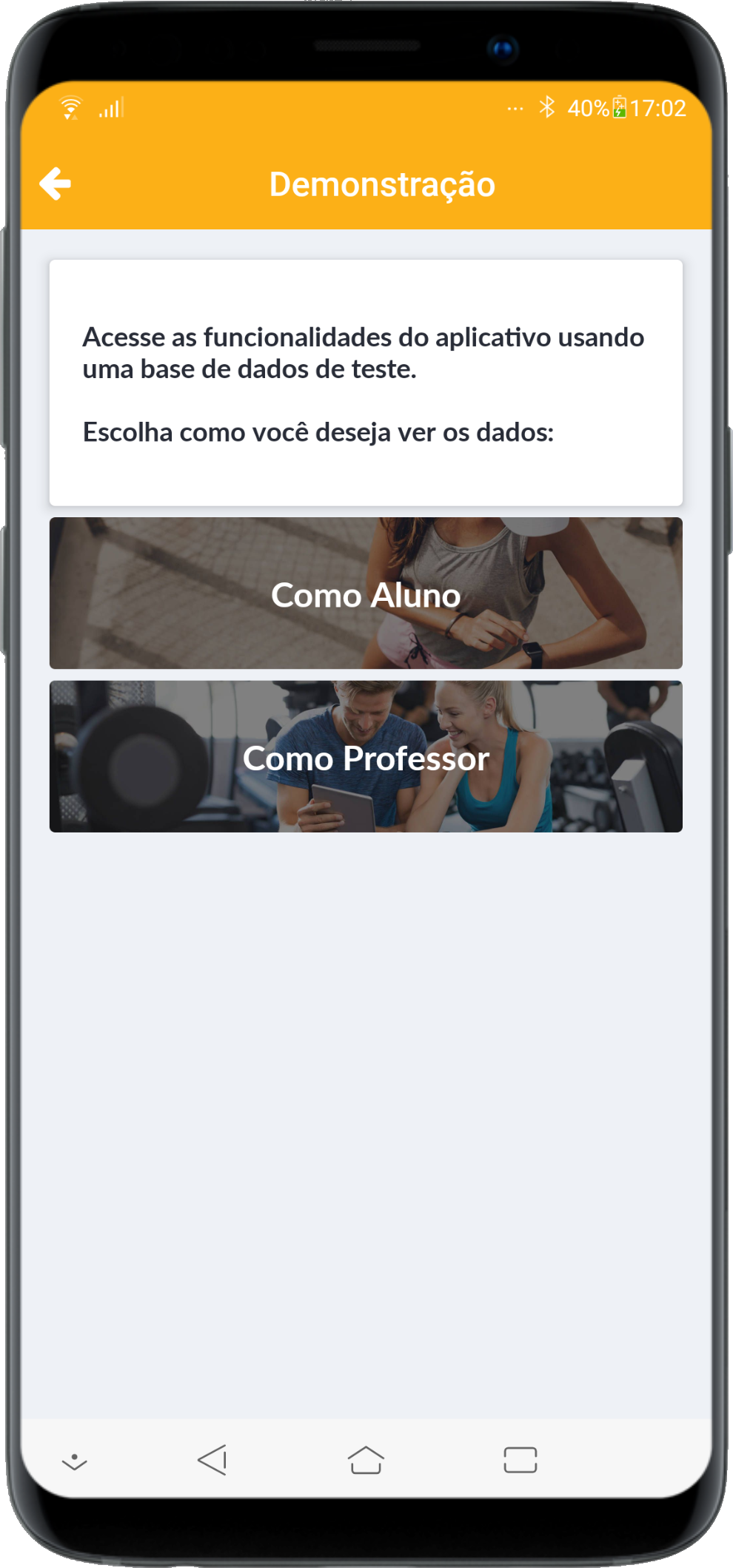 Antes de realizar o login no aplicativo do Academia.Net, é possível acessarmos o mesmo com uma conta de demonstração para a visualização das opções disponíveis. Para isso, clique em Acessar o aplicativo com uma conta de demonstração. Abaixo, descreveremos cada opção disponível: